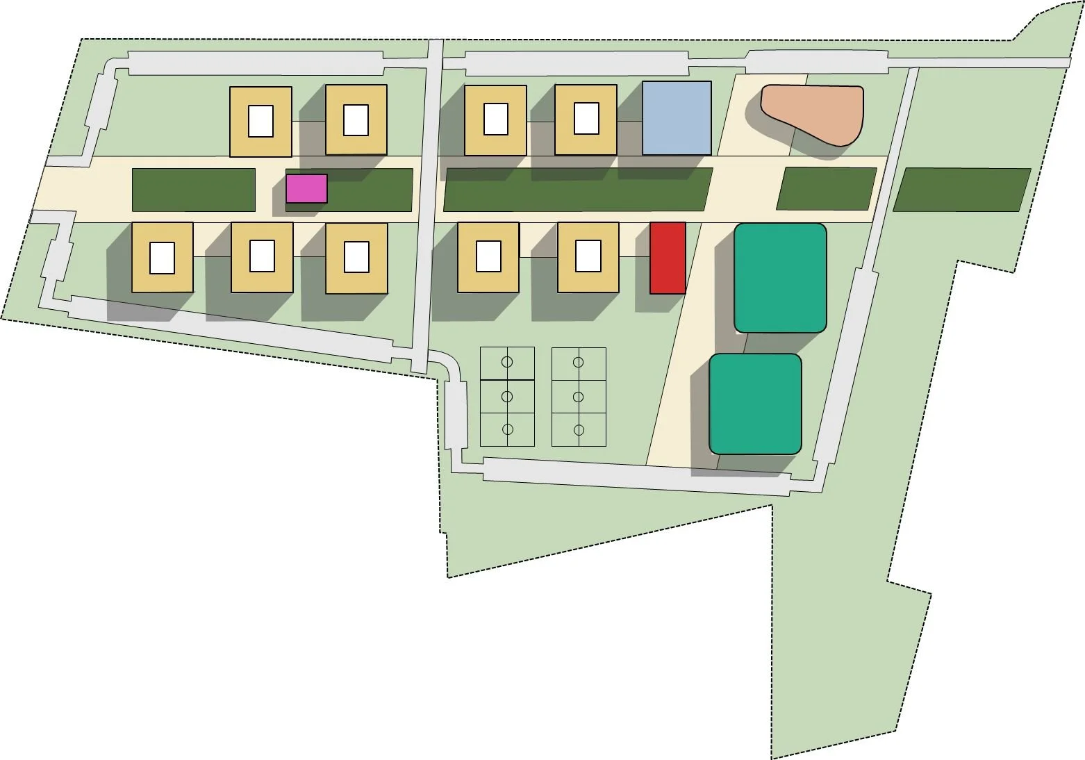 El campus se organiza a partir de un eje central en sentido oriente poniente que conecta dos áreas de desarrollo: la zona poniente con acceso desde avenida Rauquén y la zona oriente con potencial de acceso desde la Ruta 5.